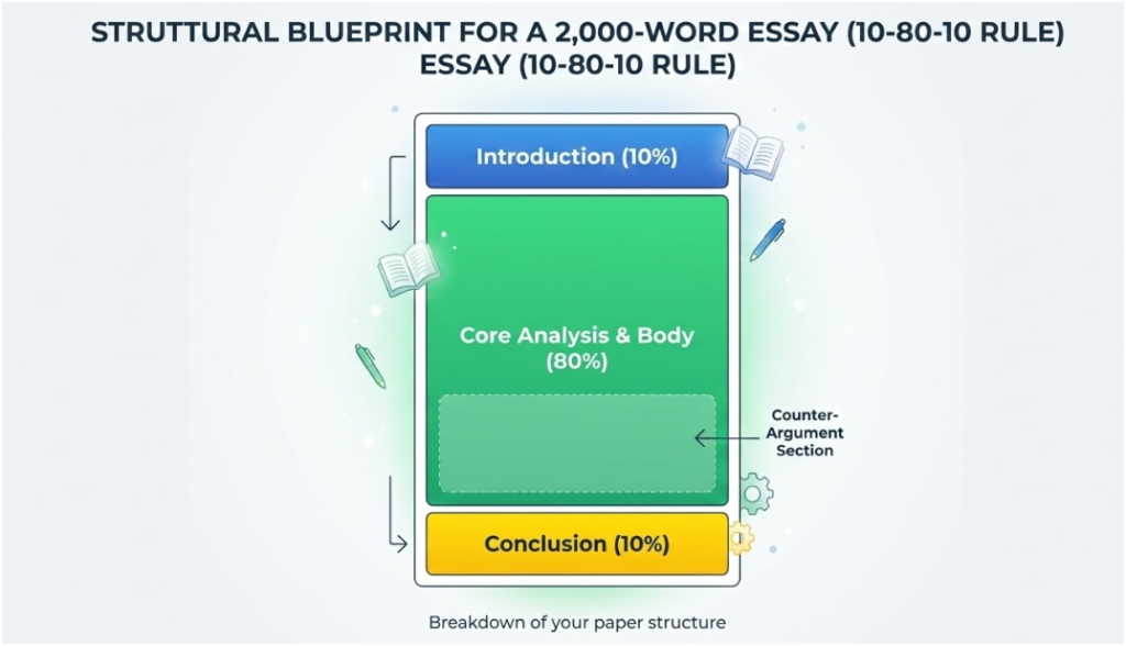 A successful essay is built on a solid skeleton. Without a structure, 2,000 words will quickly turn into a rambling mess that loses the reader. Most high-scoring papers follow a proportional distribution of content.